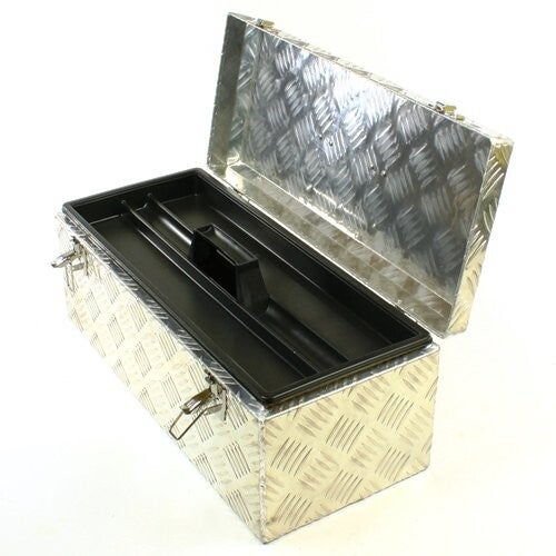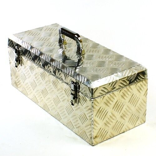afmeting: 57x24,5x22 cmLichtgewicht aluminium kist met draaggreepen uitneembare kunststof bak. Traanplaat motief.