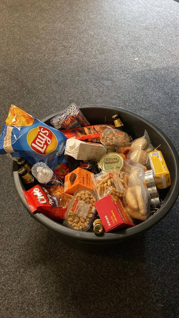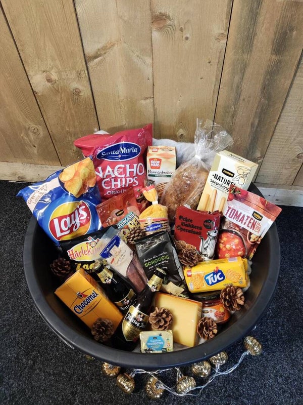 Een feestelijk gevulde speciekuip met allerlei smakelijke verrassingen.